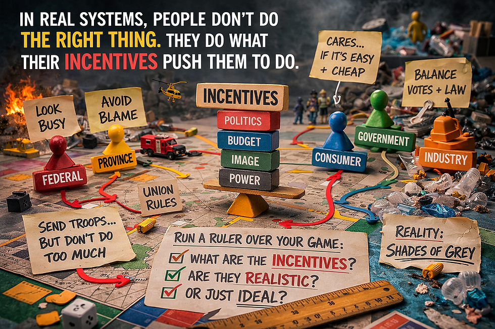 Many serious games model capabilities and processes well, but ignore incentives (also called politics). That creates a quiet failure mode in design. The game assumes every actor shares the same objective, so the system behaves like a perfectly coordinated team solving a problem as efficiently as possible. Real systems rarely work that way. Actors operate under competing pressures, and those pressures often shape outcomes more than the formal capabilities on the table. When incentives are absent, the game drifts toward an idealised world where everyone simply does the right thing. Take a wildfire response game. At the system level, the objective looks obvious: put the fires out quickly and minimise damage. But the real actors do not all want the same thing in the same way. A provincial premier may want to shift blame and responsibility upward to the federal government. The federal government may want to be seen to be acting fast, even if that means deploying troops for political visibility rather than operational effect. Provincial firefighters may resist military substitution if they think it threatens roles, budgets, or union interests. A game that ignores those incentives becomes a coordination puzzle, not a model of a political system under stress. The same problem appears elsewhere. In a plastic pollution game, it is easy to incentivise every actor to reduce plastic use. But that is not how the real system works. Consumers balance environmental concern against cost and convenience. Governments balance regulation against electoral backlash and economic pressure. Industry may want to look green while still prioritising profit. If every player is cast as a white knight, the game produces tidy answers for a world that does not exist. A simple diagnostic helps. Run a ruler over your design and ask what incentives the game creates for each actor. What do they gain by acting in certain ways? What trade offs or pressures shape their decisions? If those incentives do not resemble the real system you are exploring, the model will likely produce elegant answers that rarely survive contact with policy reality. Fortunately, modelling incentives does not require a full political simulation. A few simple mechanics can introduce much of the necessary tension. Give each player multiple objectives rather than a single shared goal. Keep some objectives hidden or only partially visible. Introduce negotiation so players can bargain, trade resources, or exchange favours. Give them something of value to trade, whether money, influence, reputation, or game points. The aim is not complexity for its own sake. It is to make players face competing motivations rather than simply optimise a shared system outcome. Capabilities matter. But incentives usually determine how those capabilities are actually used.